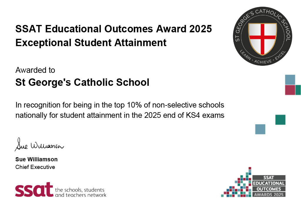 St. George's School is an independent Academy School and part of the Cardinal Hume Academies Trust. We are an ordered and exciting Catholic learning community achieving the highest standards for boys and girls aged between eleven and nineteen.
